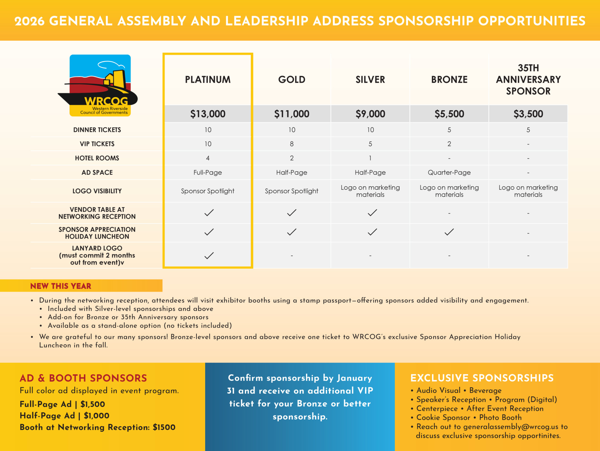 Sponsorship opportunities are available. Want to know more about sponsorships and benefits? Visit www.wrcog.us/GAsponsor or reach us at generalassembly@wrcog.us.